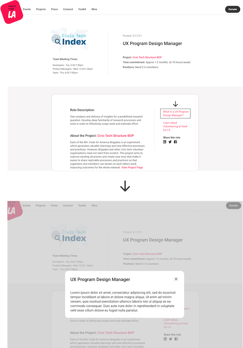 In the end, our final designs were popular in user testing and approved by our stakeholders. The designs are currently awaiting the designs of the CMS portion of the roles page. Project PMs at Hack for LA will log in and submit, edit, or take down roles in real time in order to take busy developers out of this process, and allow the page to stay up to date. This will likely take a while to launch because of the complicated backend involved.